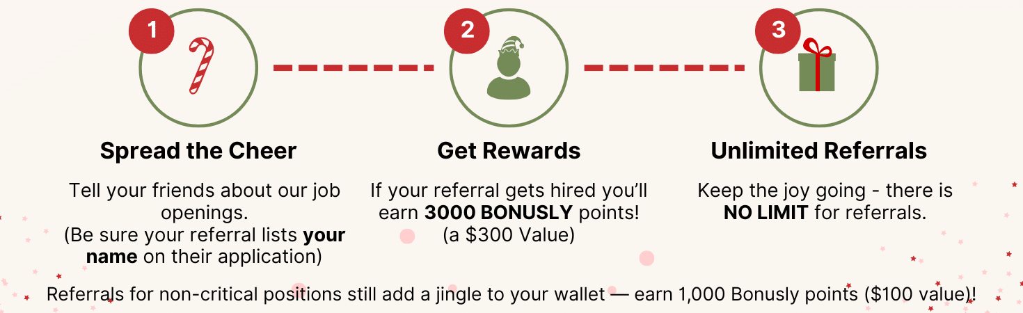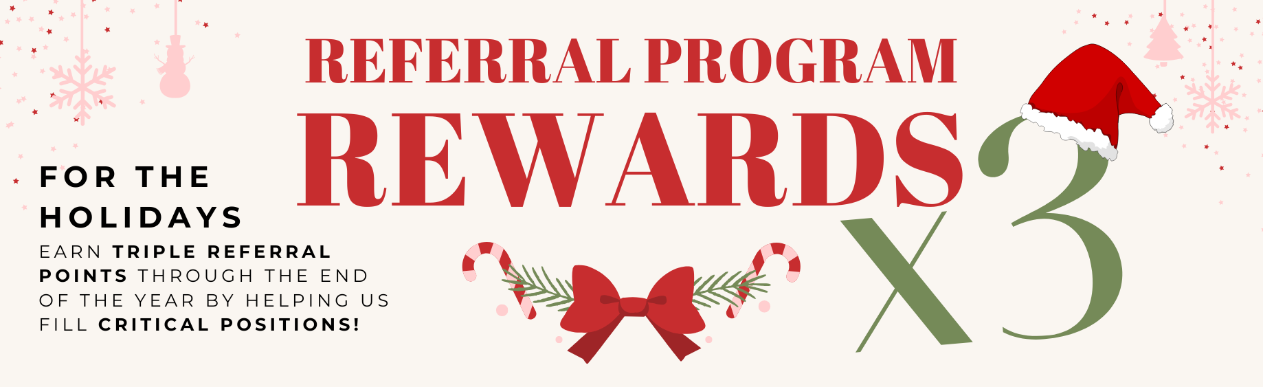 Help us fill CRITICAL POSITIONS and you can earn Triple Rewards for any referral that results in filling the position.  That’s a $300 value!